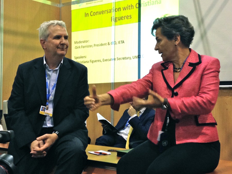 5 December 2014 | Lima, Peru |The first thing Christiana Figueres, the Executive Secretary of the United Nations Framework Convention on Climate Change (UNFCCC), did during her conversation with International Emissions Trading Association (IETA) President Dirk Forrister on Wednesday was rearrange the room. Sans microphones, Figueres and Forrister perched on the front of their desk and invited audience members to gather around fireside-chat style, with some people sitting cross-legged on the floor. It was a fitting arrangement for a discussion about carbon markets that have emerged from the ground up.
